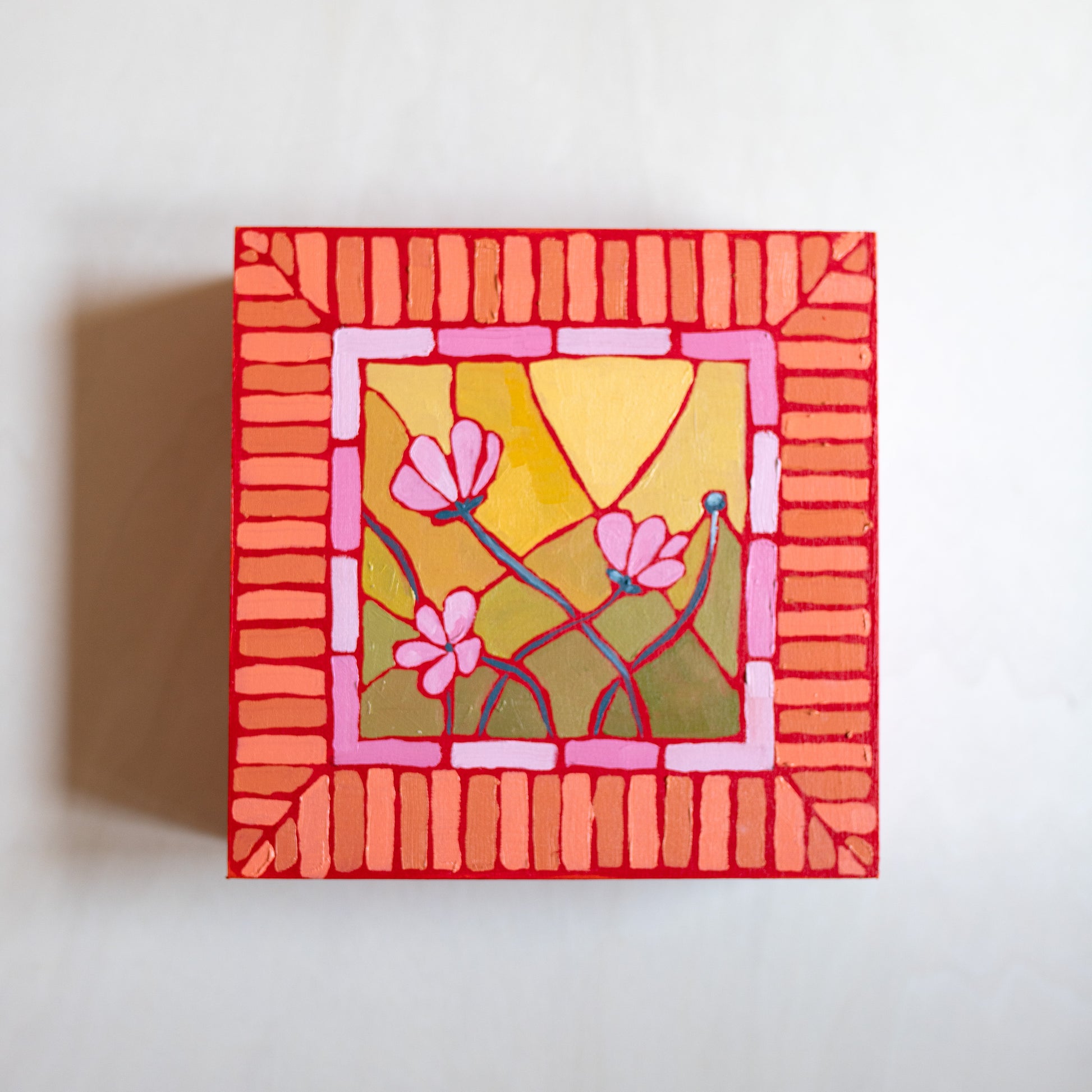 This work is an original 6x6" oil painting on wood panel. The piece has pink checkers on all 4 sides, with a 2in depth. The price includes shipping within the US. Each painting comes signed on the back.